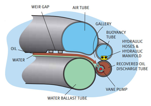 A Weir Boom é uma barreira de contenção com sistema integrado de recolhimento de óleo, construída em borracha neoprene e dotada de um flutuador inflável, que proporciona estabilidade, uma tubulação base, preenchida com água para lastro, outra tubulação com vertedouros e bombas de palhetas, que permite o recolhimento de óleo.