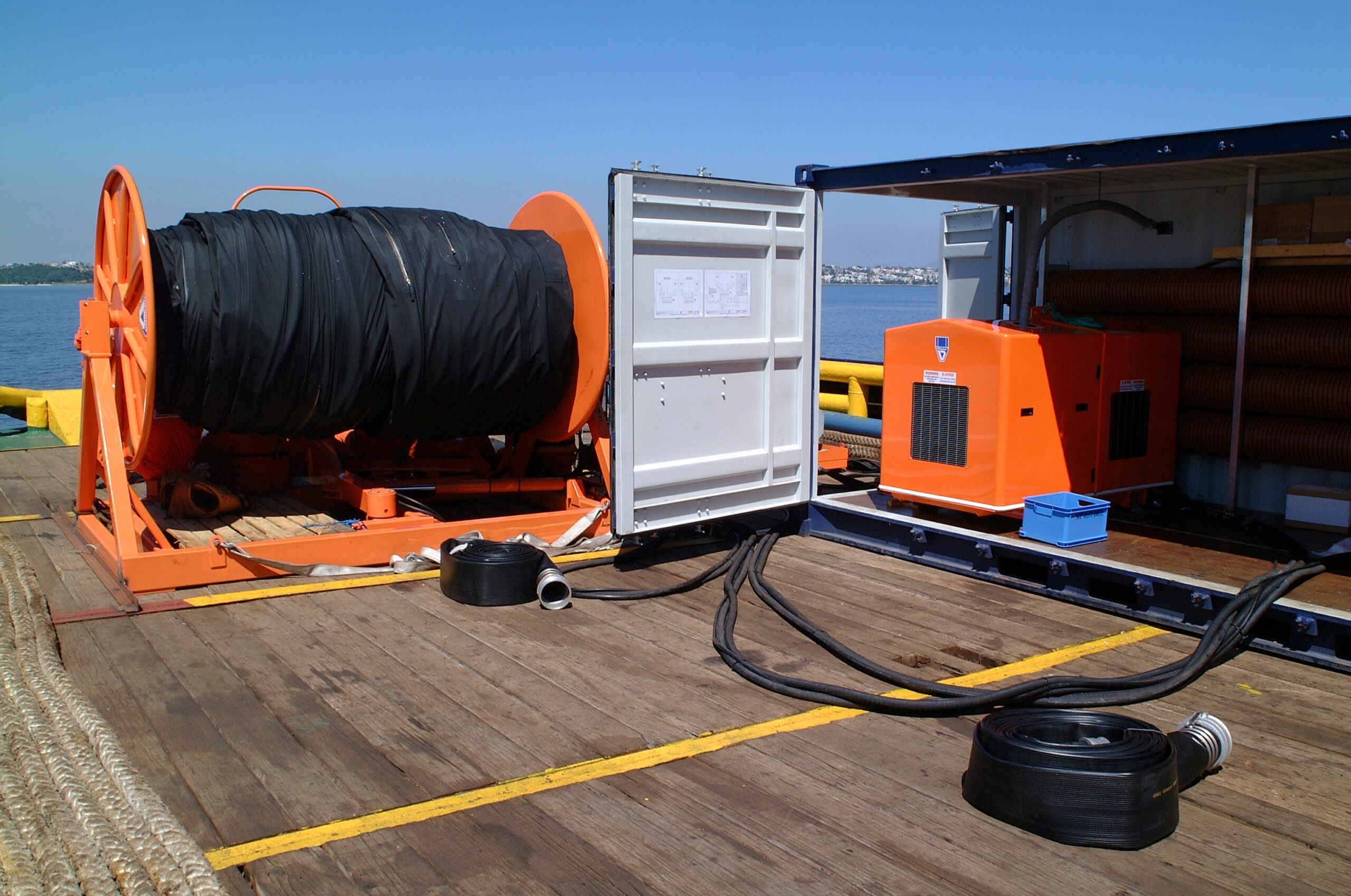 A barreira e o recolhedor de vertedouro podem ser lançados diretamente do carretel, não havendo necessidade de grua ou pau de carga. O sistema permite operar em mau tempo sem comprometer a operação.
