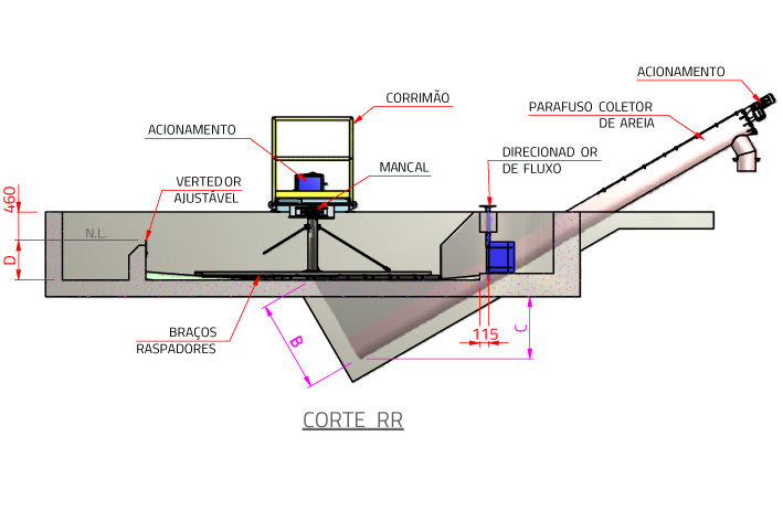 A caixa de areia tipo CS é aplicada em tanques quadrados, sendo o recolhimento da areia realizado por um raspador de fundo, com campo de ação circular que encaminhará a areia decantada para um poço de descarga, a partir de onde o mecanismo de lavagem de areia coletará o material.