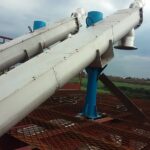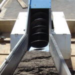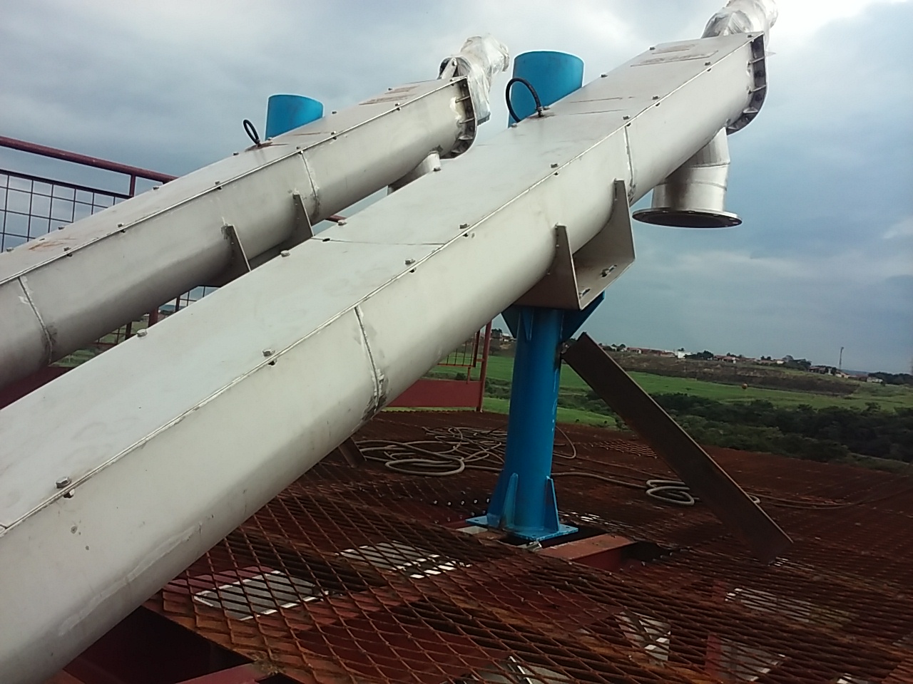 – Parafuso classificador: O parafuso possui uma inclinação de 30º, montado dentro de uma canaleta metálica com tampas removíveis em sua parte superior. O parafuso será composto de abas de aço montadas sobre um tubo do mesmo material, dimensionado de forma adequada a não permitir uma deflexão maior que 5 mm entre os mancais. O eixo superior do parafuso conecta-se diretamente ao redutor passando por um mancal de rolamento flageado à calha. O mancal inferior do parafuso é do tipo bucha de bronze, apoiada em eixo girante fixado na calha.