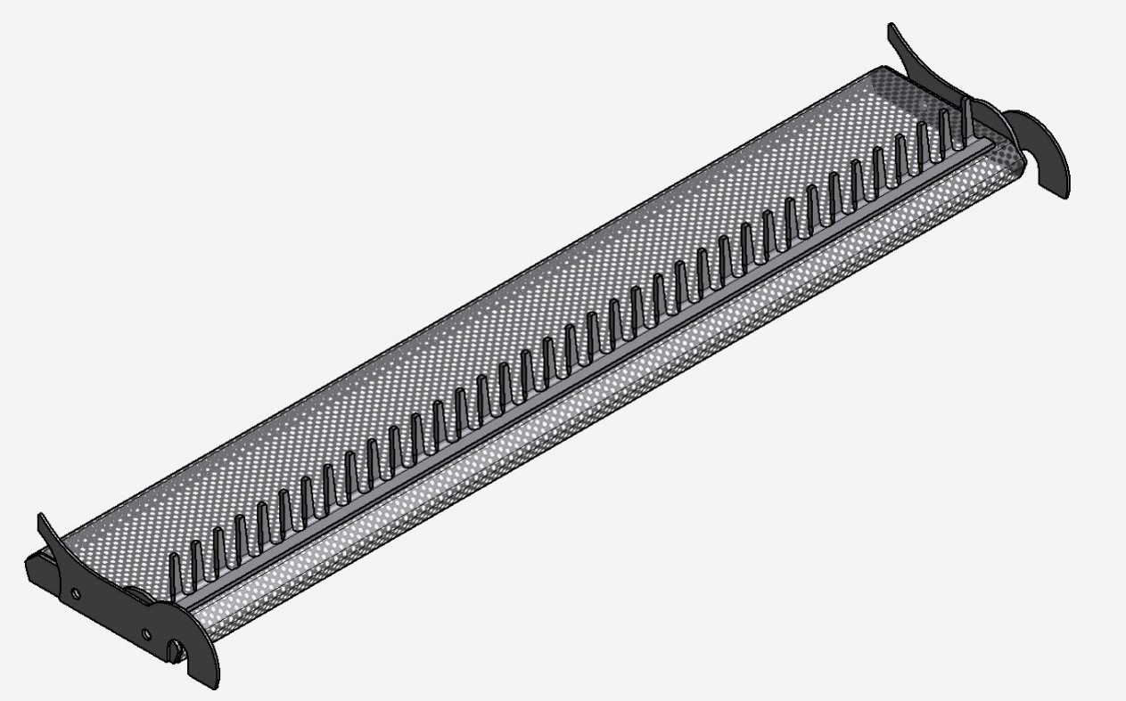 Esta peneira fina é formada por elementos filtrantes de ABS, chamados “dentes”, montados sobre dois eixos consecutivos em aço inoxidável. Nos extremos destes eixos estão instaladas as correntes de arraste da tela filtrante. O conjunto, com o sistema motriz e outros elementos, está montado numa estrutura de aço inoxidável.