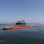 barreira de contenção inflável com redundância, carretel e motor hidráulicos, boomvane e uma unidade de energia. Todos os